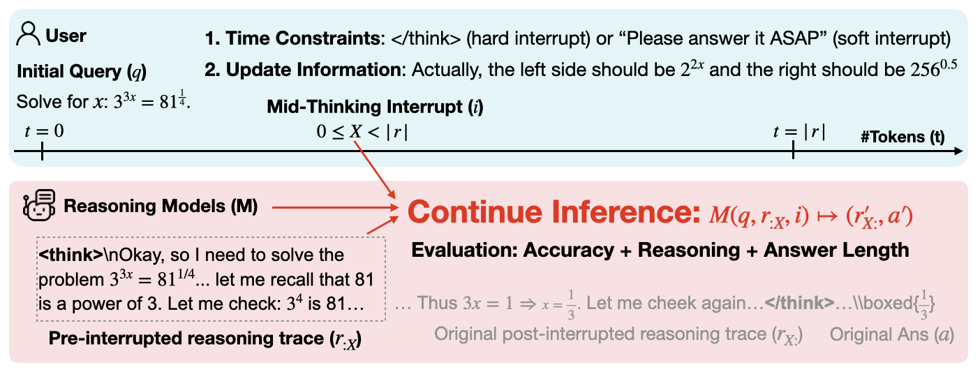 Because LRMs' reasoning and inference can take a lot of time, users often don't want to wait for them to finish. Instead, they want to interrupt mid-inference: forcing an immediate answer (hard interrupt), asking the model to accelerate (speedup), or changing the task specification (info update). We explore how well LRMs handle these interruptions and dynamic context changes across math and coding tasks. The figure below illustrates our evaluation protocol: