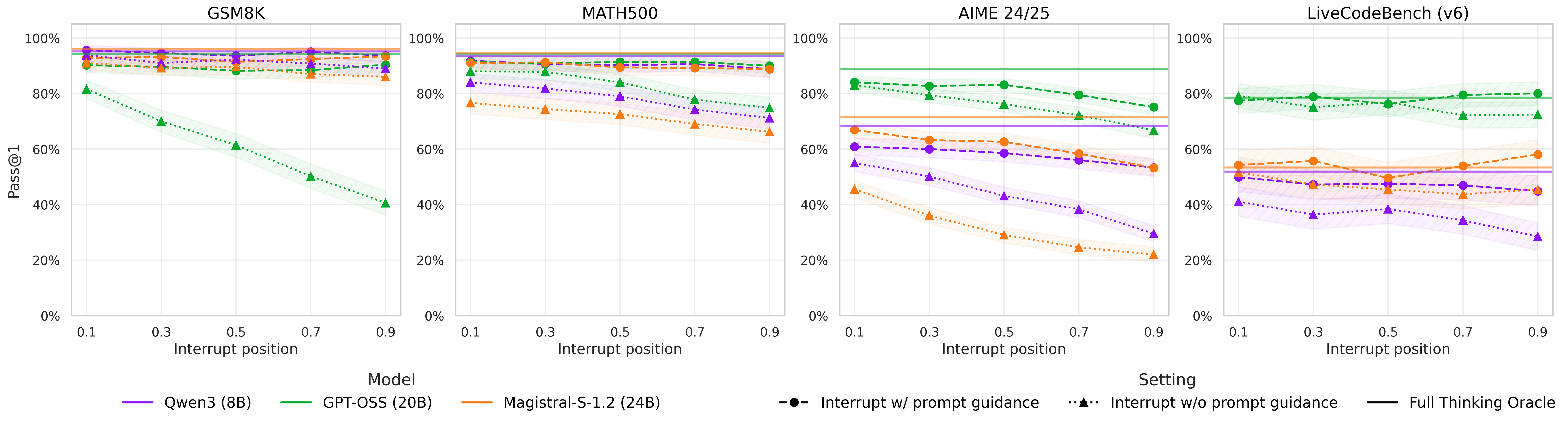 Takeaway: Current LRMs show only partial anytime behavior, thanks to reasoning leakage. In the future, we need to understand and mitigate this leakage to build truly interruptible models.